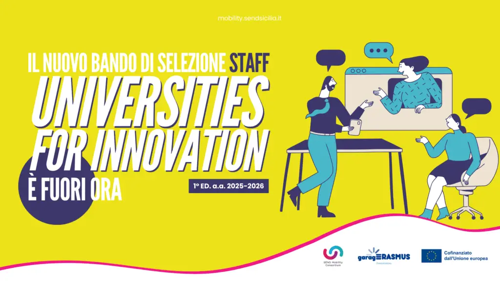 In riferimento al bando di selezione STAFF “ Universities for Innovation” dello scorso 3 novembre promosso dal Consorzio di Mobilità Send nell’ambito del programma Erasmus+, si rende pubblica la graduatoria di idoneità e il relativo regolamento di accettazione. Gli ASSEGNATARI dovranno inviare entro il 18 GENNAIO 2026 il modulo di ACCETTAZIONE o RINUNCIA a mobility@sendsicilia.it. COSA FARE PRIMA DELLA PARTENZA? 1. Scaricare la documentazione al […]